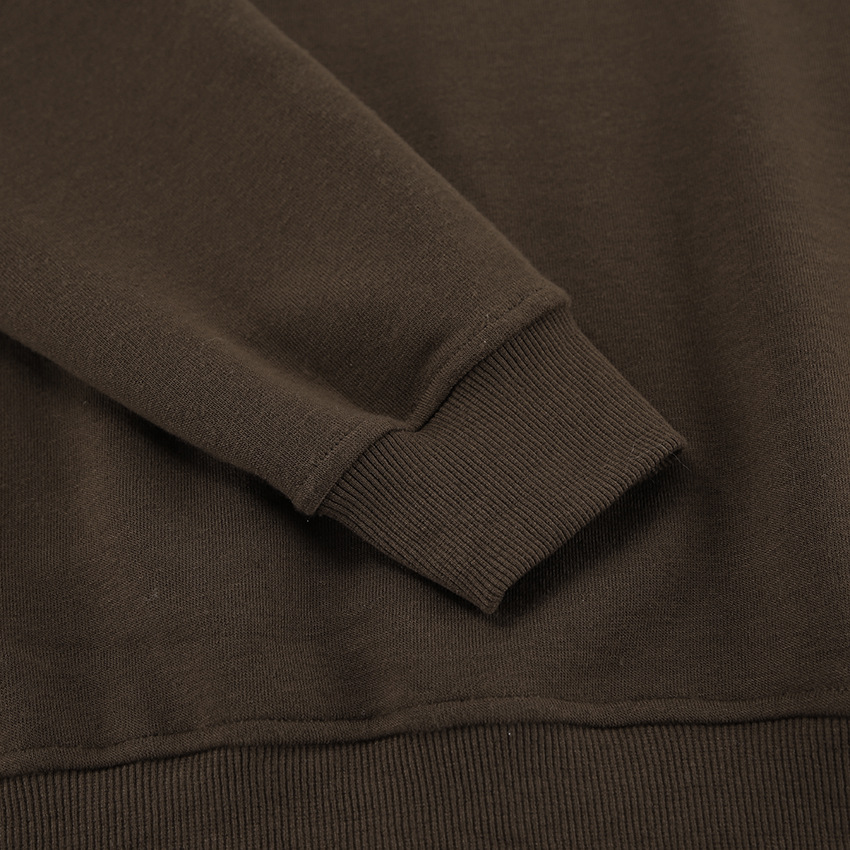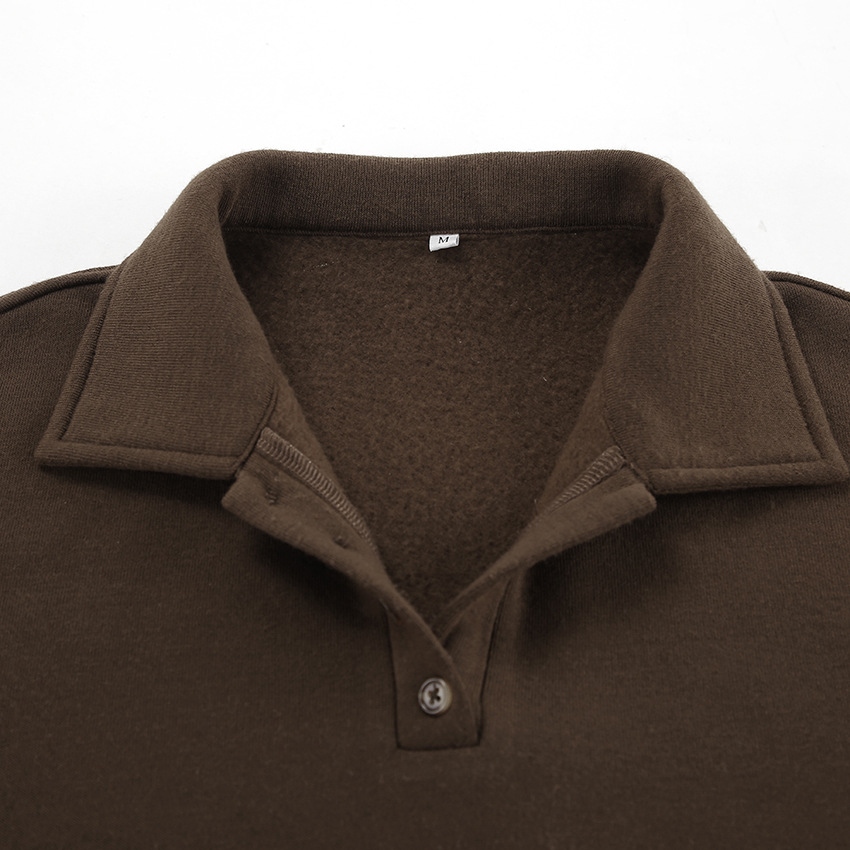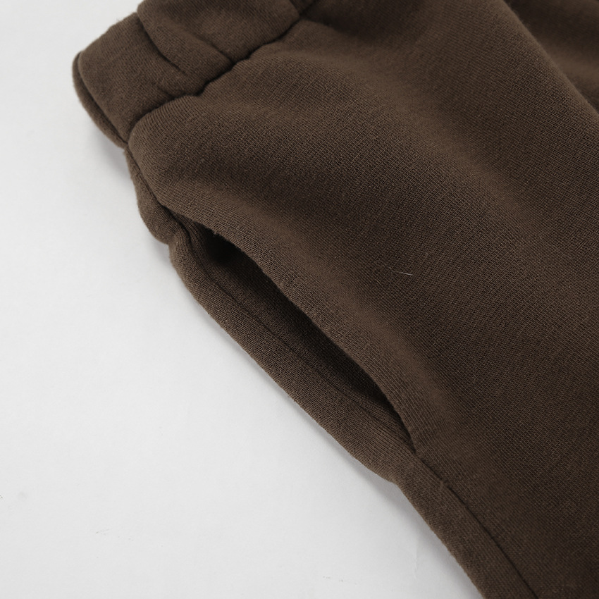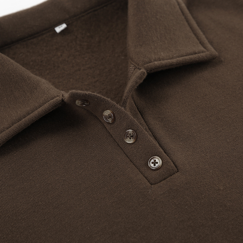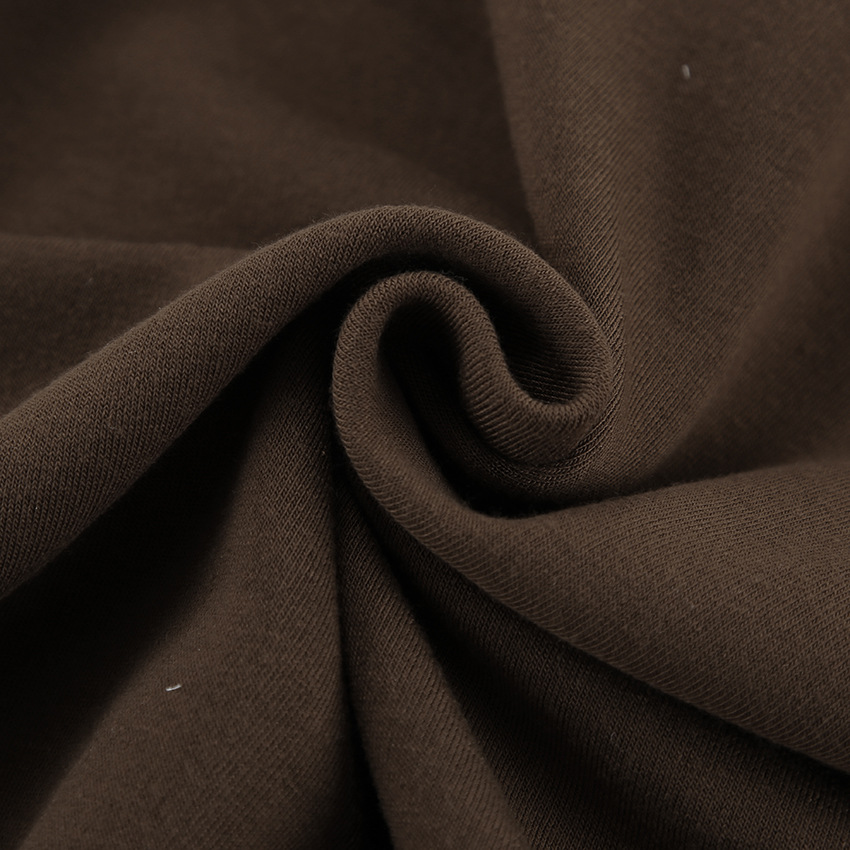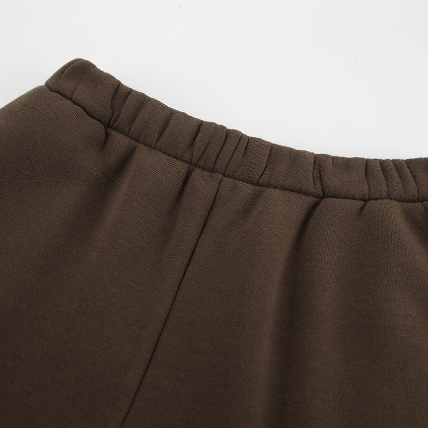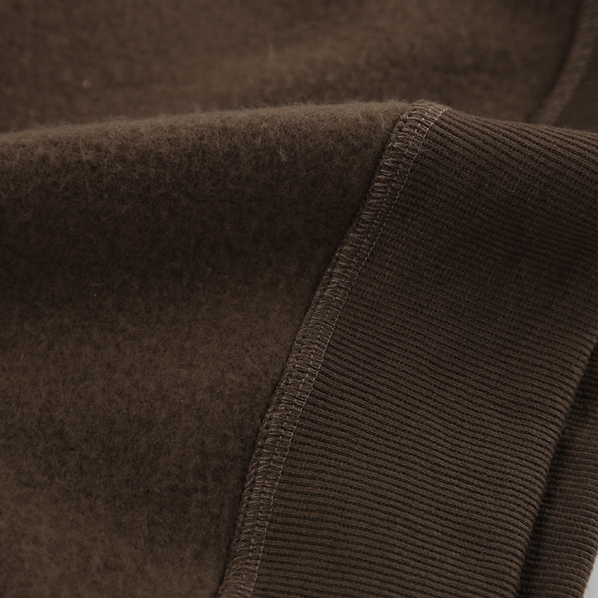O produto é descrito como "Brown With Velvet Long Sleeve Knitted Fleece Shorts Suit", indicando uma mistura de texturas: é de Malha (Knitted) ou Tecido de Pelúcia (Fleece) com detalhes que remetem a Veludo (Velvet), oferecendo um toque quente e macio. Apesar de ter um corte Solto (Loose Fit) e estilo Casual, ele é classificado como Elegante e Retrô, sendo uma opção versátil para combinar facilmente (Easy Matching).