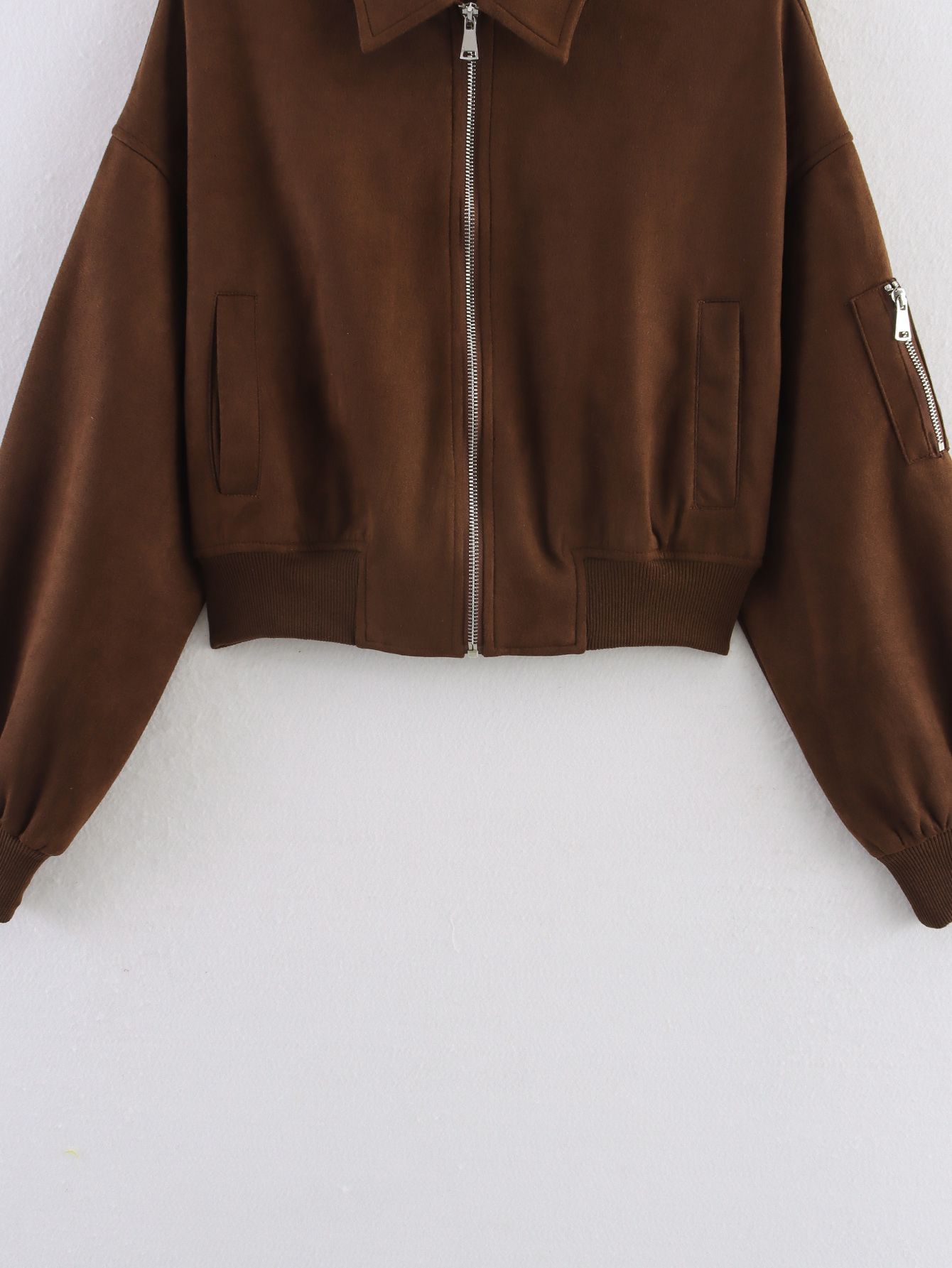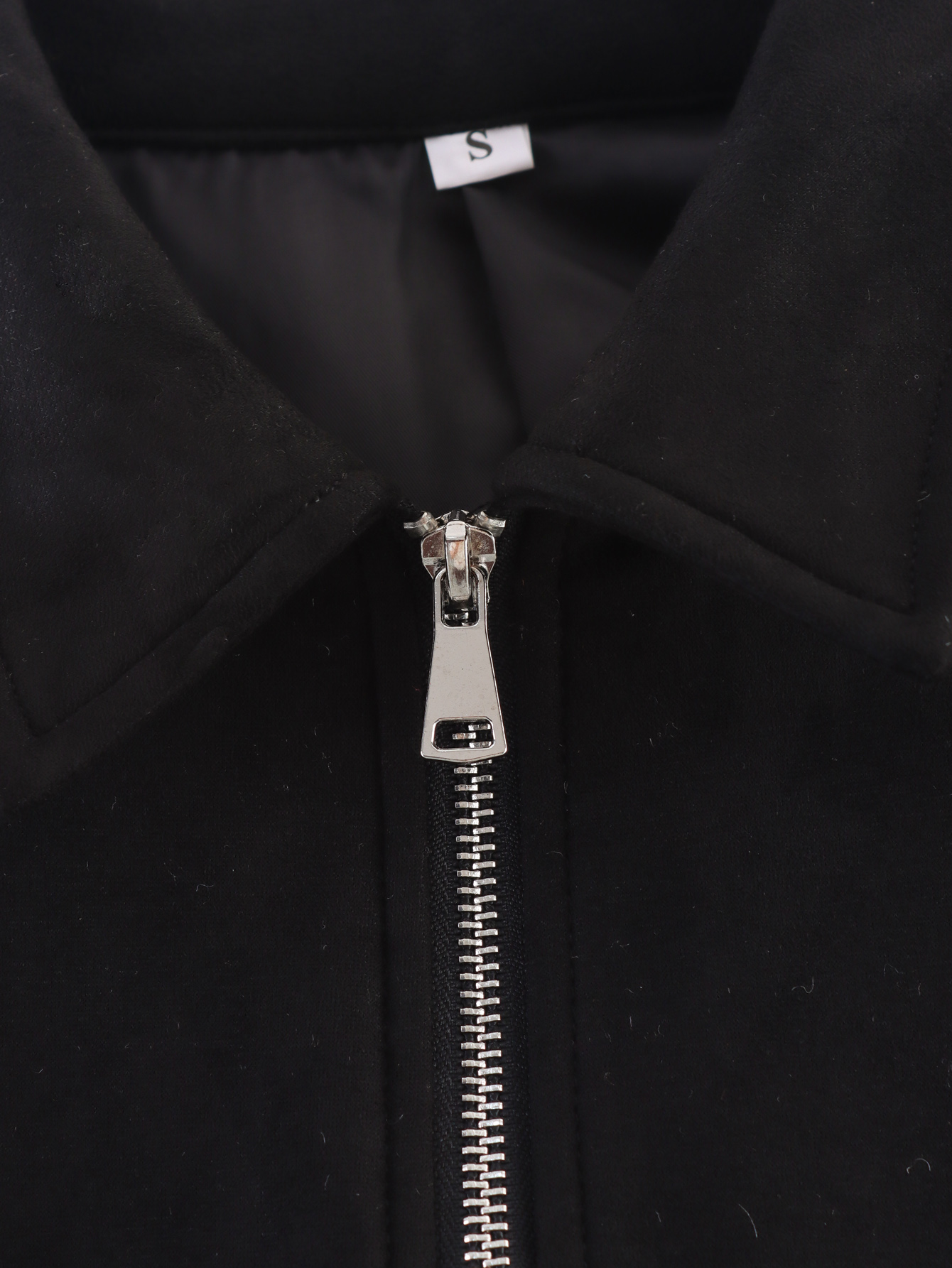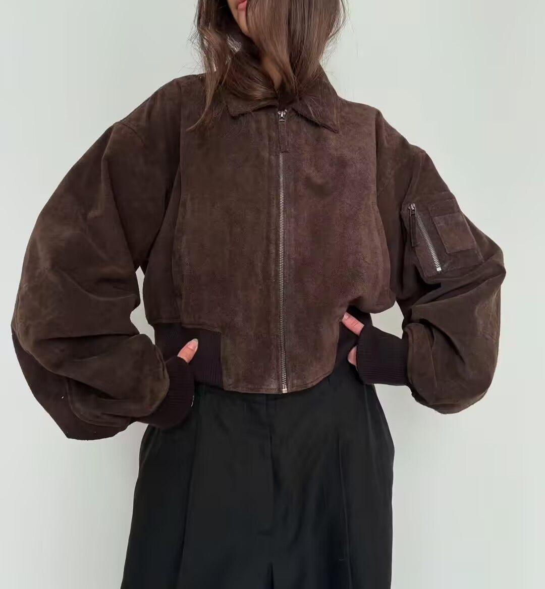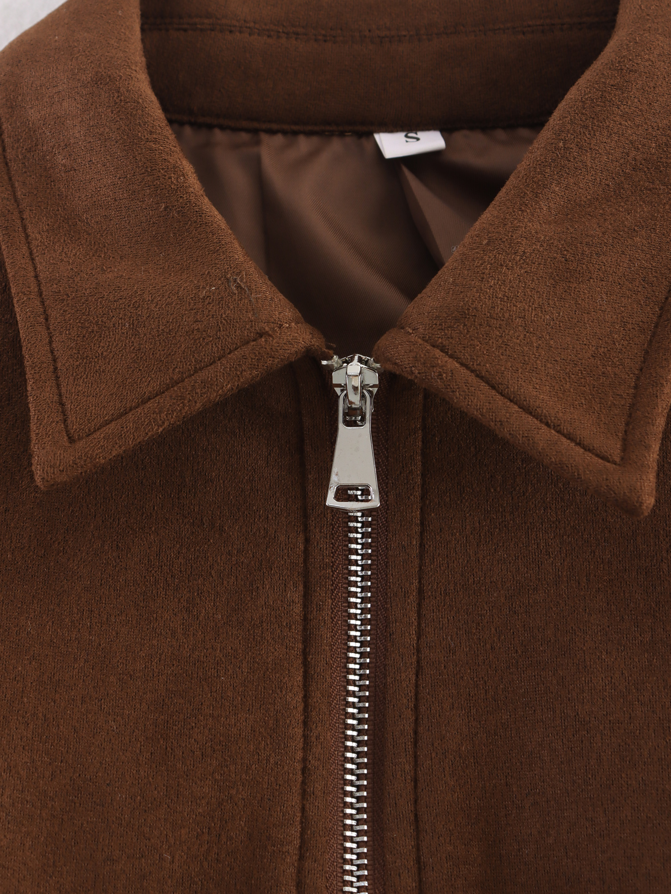 A peça é notável pelo seu tecido principal, o Suede (camurça sintética ou com acabamento de camurça), que confere uma textura suave e sofisticada, ideal para o Outono/Inverno. Possui Gola (Collared), fechamento em Zíper (Zipper) e Cintura Elástica (Elastic Waisted), que ajuda a definir a silhueta, apesar do ajuste ser solto no corpo. A composição principal listada é o Poliéster.