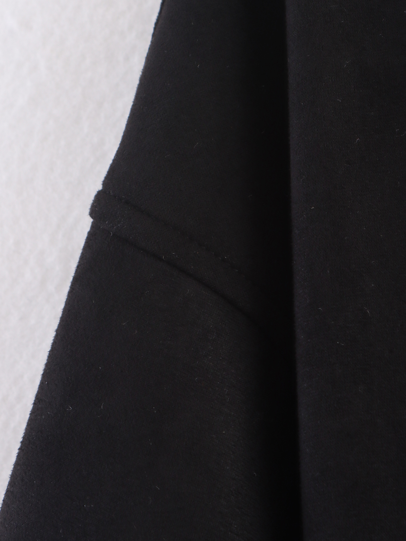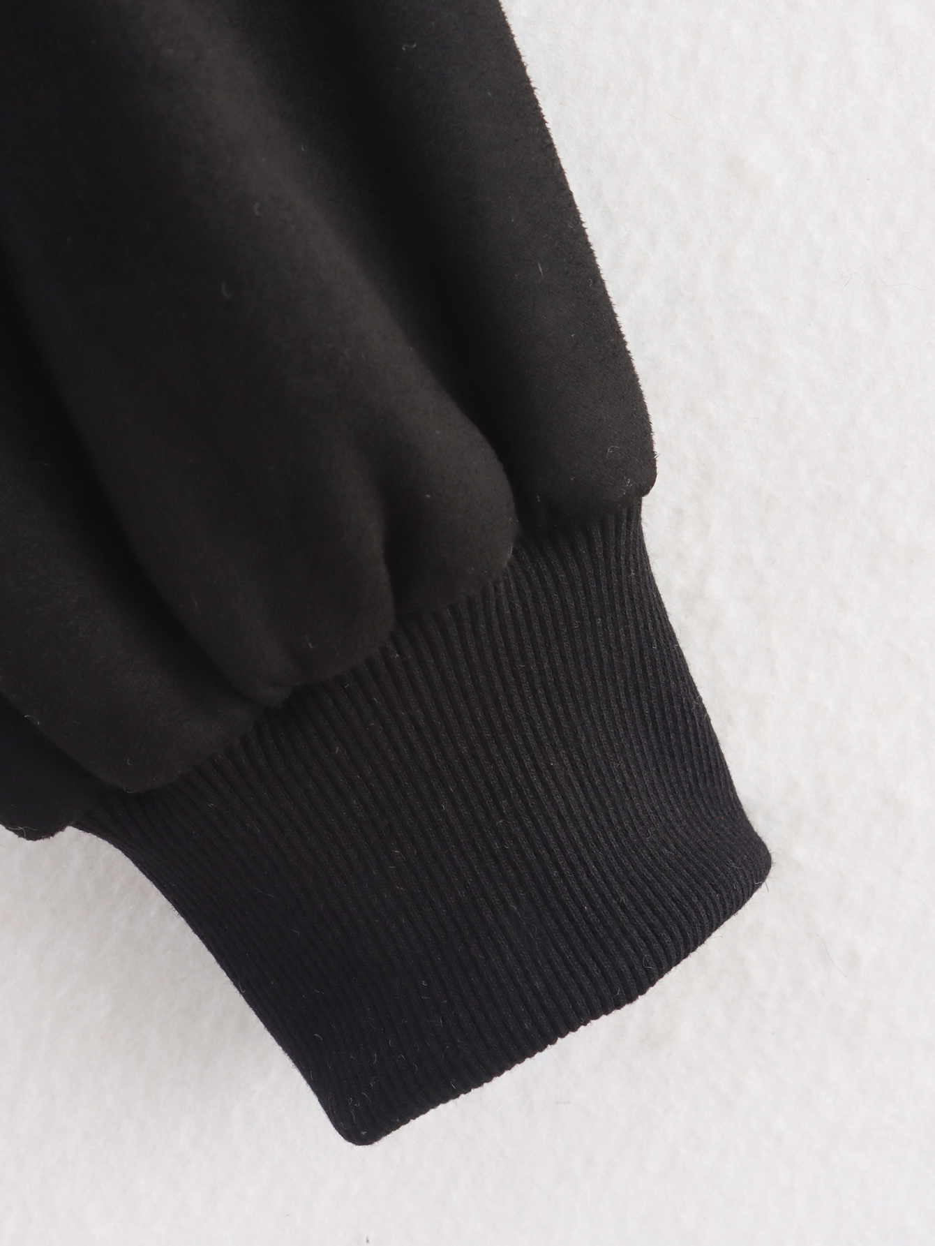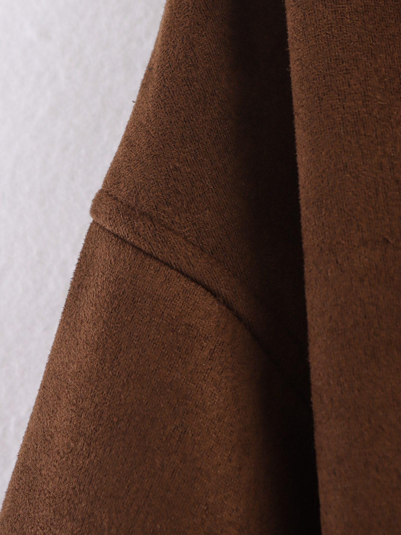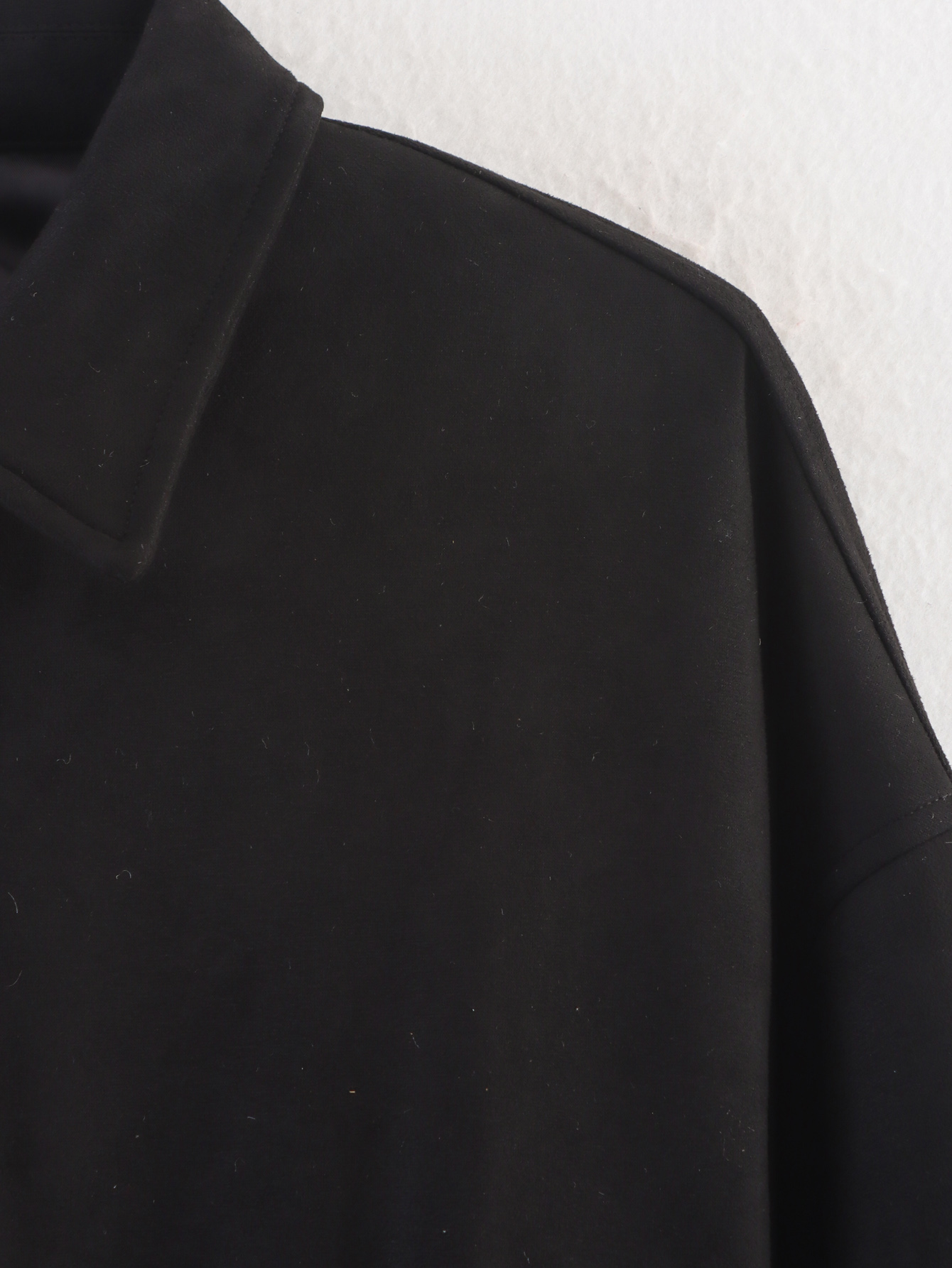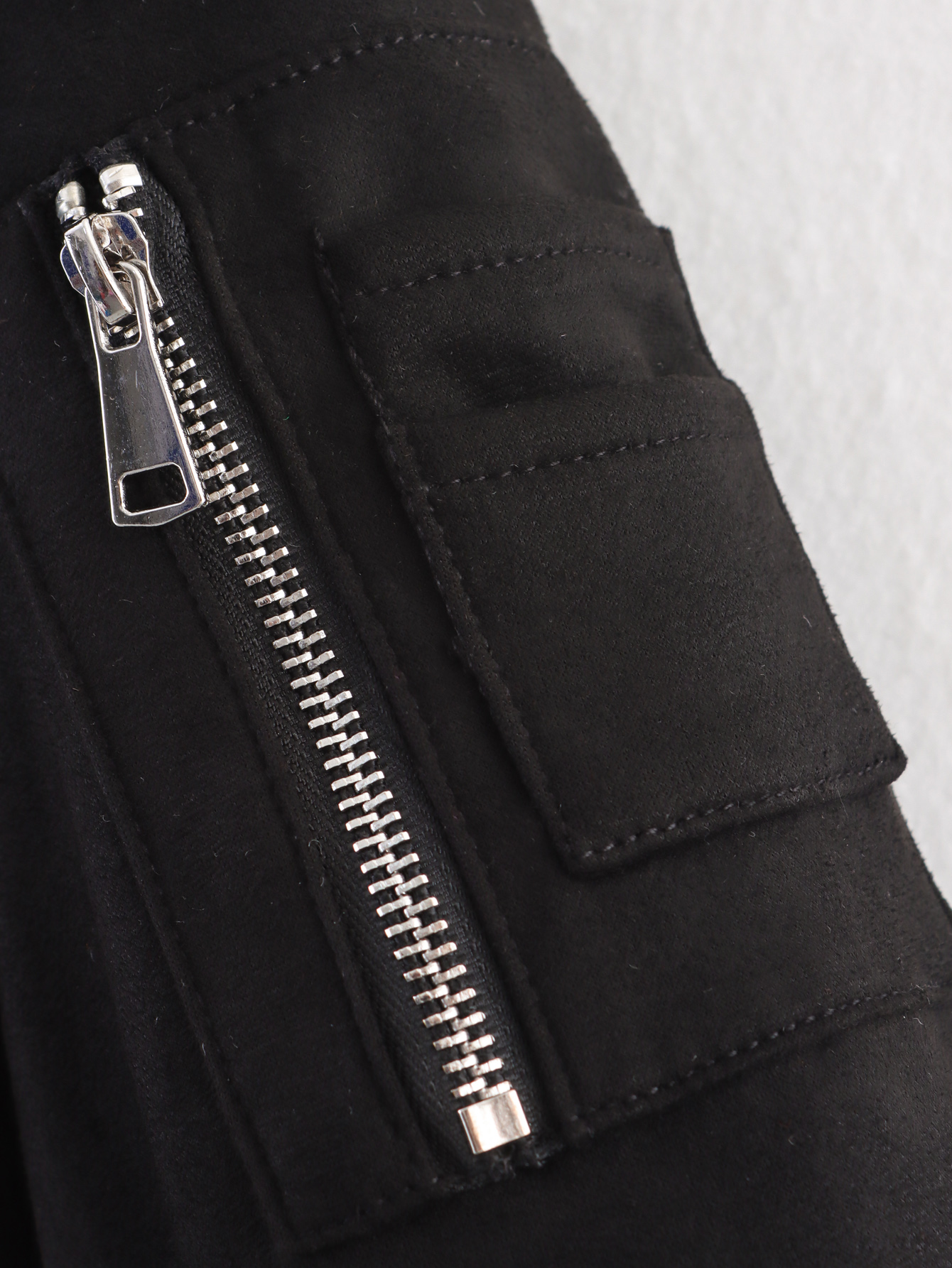 A peça é notável pelo seu tecido principal, o Suede (camurça sintética ou com acabamento de camurça), que confere uma textura suave e sofisticada, ideal para o Outono/Inverno. Possui Gola (Collared), fechamento em Zíper (Zipper) e Cintura Elástica (Elastic Waisted), que ajuda a definir a silhueta, apesar do ajuste ser solto no corpo. A composição principal listada é o Poliéster.